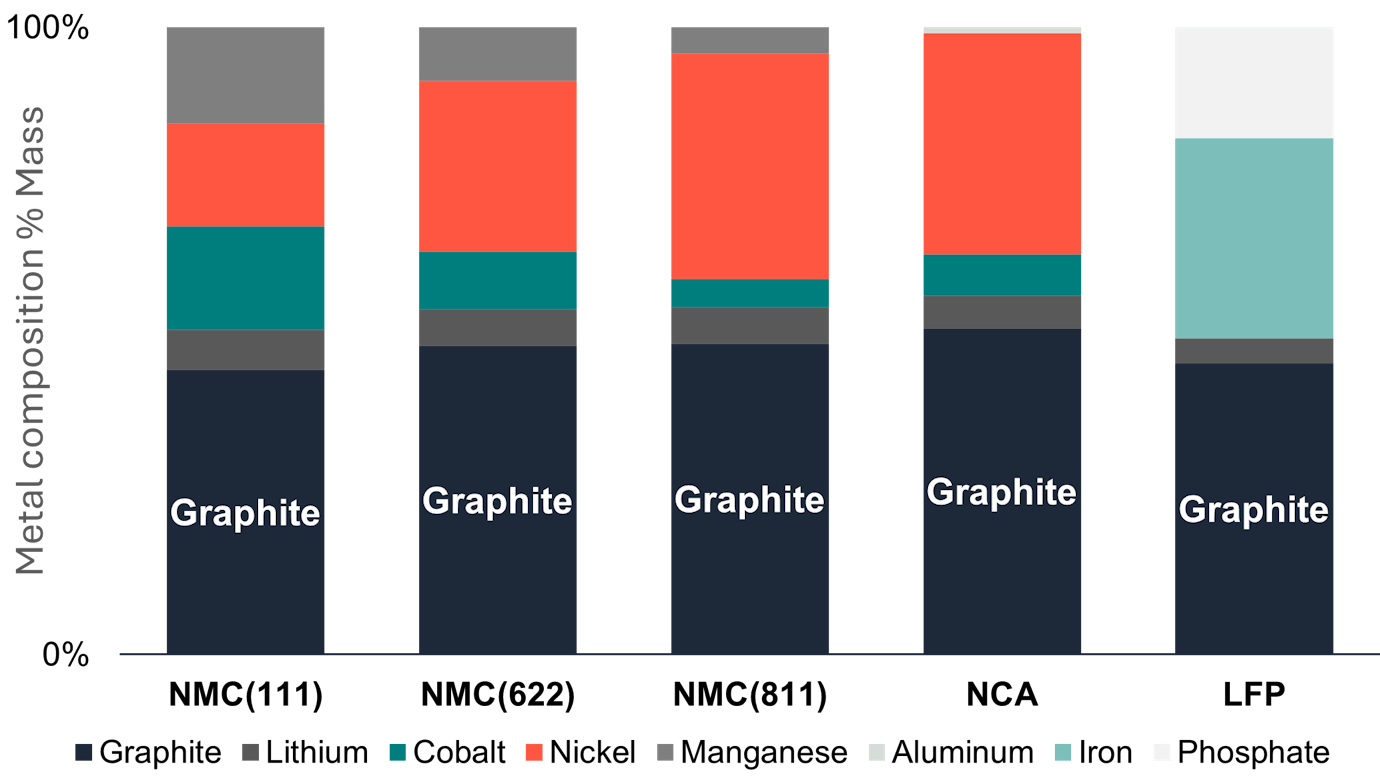 Graphite is the dominant input material in active anode materials for lithium-ion batteries across all cathode chemistries, including high nickel content (NCM and NCA) and lithium iron phosphate (LFP) batteries.